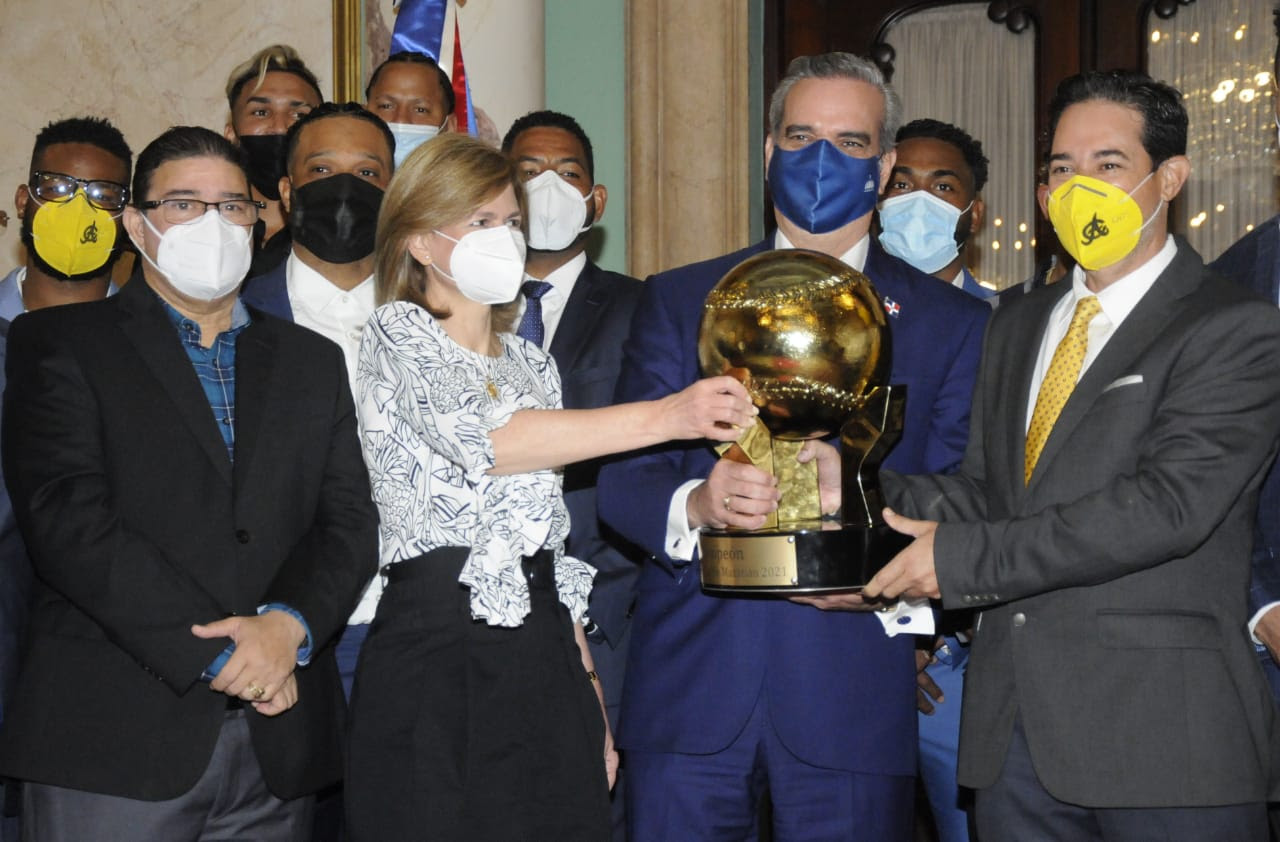 La escuadra del Cibao fue recibida en Palacio por segunda vez en una semana, en esta ocasión en condición de campeones de la Serie del Caribe de 2021. “Ese día le entregué la bandera y se la entregué convencido de que ustedes traerían el campeonato, pero yo les pedí que ganaran, no que abusaran”, apuntó en mandatario. “Ganar siete juegos de siete no es tarea fácil, pero ustedes lo hicieron”.