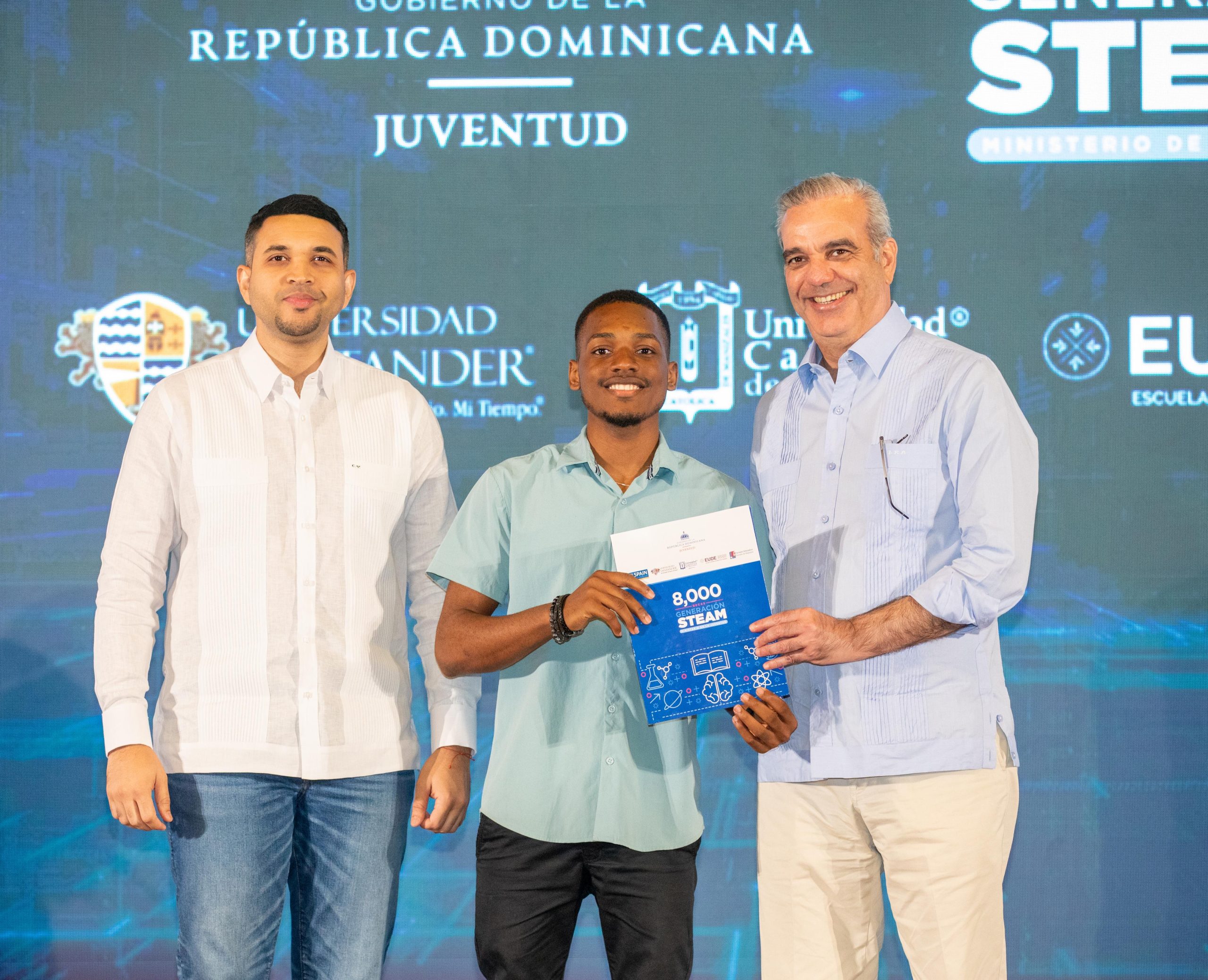 “Hoy entregamos estas becas del programa Generación STEAM, una iniciativa que busca fortalecer la formación de jóvenes dominicanos en áreas estratégicas para el futuro del país”, expresó.
