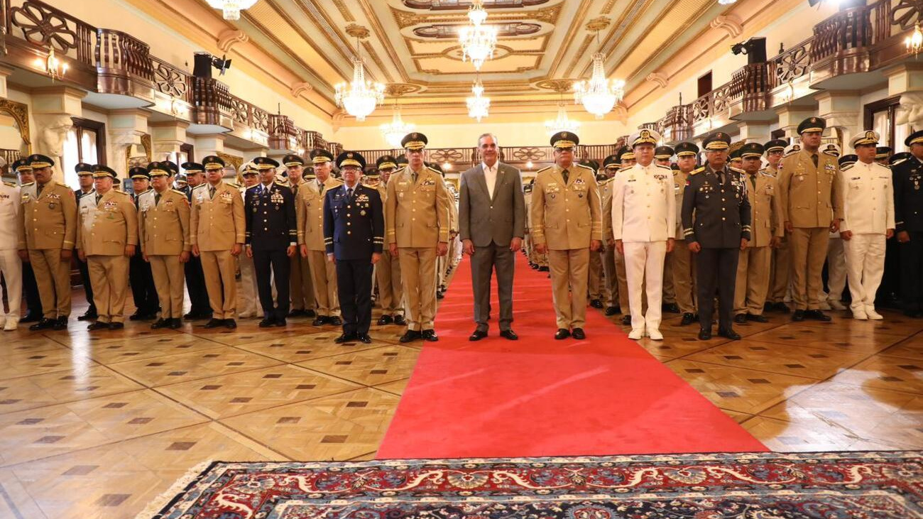 Santo Domingo.- El presidente Luis Abinader recibió este jueves el saludo solemne de cinco promociones de oficiales de las Fuerzas Armadas y la Policía Nacional, al conmemorarse el 20,25,30,35 y 40 aniversario de servicio ininterrumpido en las filas de estas instituciones, a quienes expresó su orgullo y agradecimiento por su labor en defensa de la patria y su compromiso de seguir fortaleciéndolas.