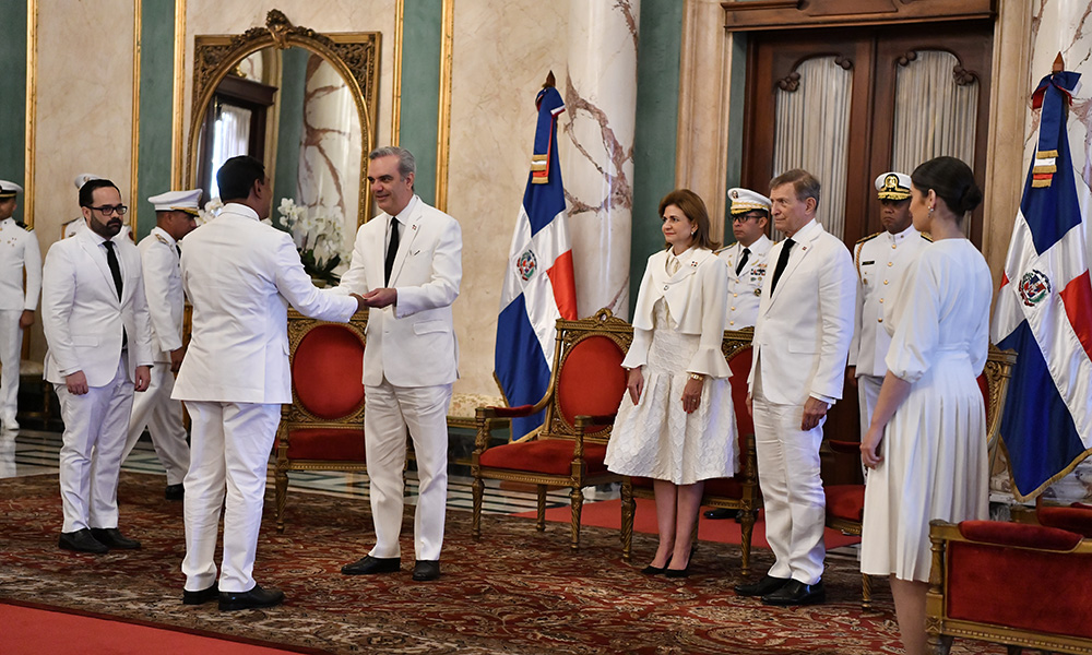 En una ceremonia solemne en el Palacio Nacional, el mandatario, junto a la vicepresidenta, Raquel Peña, y al ministro de Relaciones Exteriores, Roberto Álvarez, recibió a los diplomáticos que presentaron sus credenciales ante el Estado dominicano.