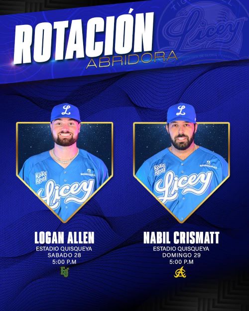 SANTO DOMINGO, EE.UU.- Los Campeones Nacionales y del Caribe, Tigres del Licey, anunciaron a Logan Allen y Nabil Crismatt como abridores para este sábado y domingo ante Estrellas Orientales y Águilas Cibaeñas, respectivamente.