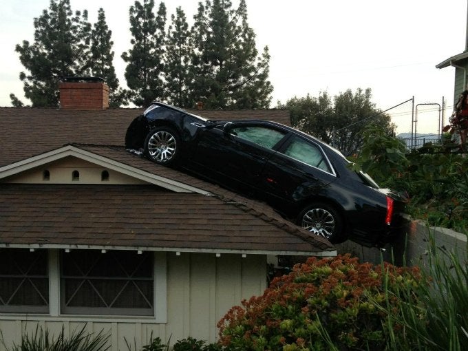 El automóvil luego pasó por un terreno irregular y aparentemente fue catapultado al aire, terminando en el techo de un granero a unos 3 metros (10 pies) del suelo.
