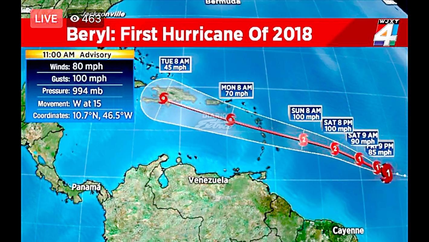 La Oficina Nacional de Meteorología (Onamet) informó que Beryl continúa siendo un peligroso huracán de categoría 5. Se localiza en la latitud 14.7 norte y longitud 67.1 oeste, aproximadamente a unos 415 kilómetros al sureste de Isla Saona (La Romana). Tiene vientos máximos sostenidos de 270 kilometros por hora y se desplaza hacia el oeste-noroeste a unos 35 kilometros por hora.