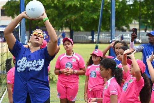 Camil Domínguez, de las Reinas del Caribe, imparte clínica a niñas del Campamento de Verano del Club Atlético Licey