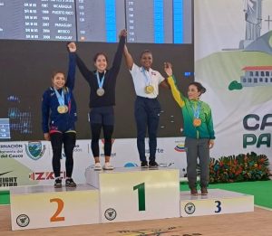 La dominicana fue escoltada por la brasileña Emily Rosa Figueiredo, ganadora de las tres preseas de plata con marcas de 77, 100 y 177 kilos.
