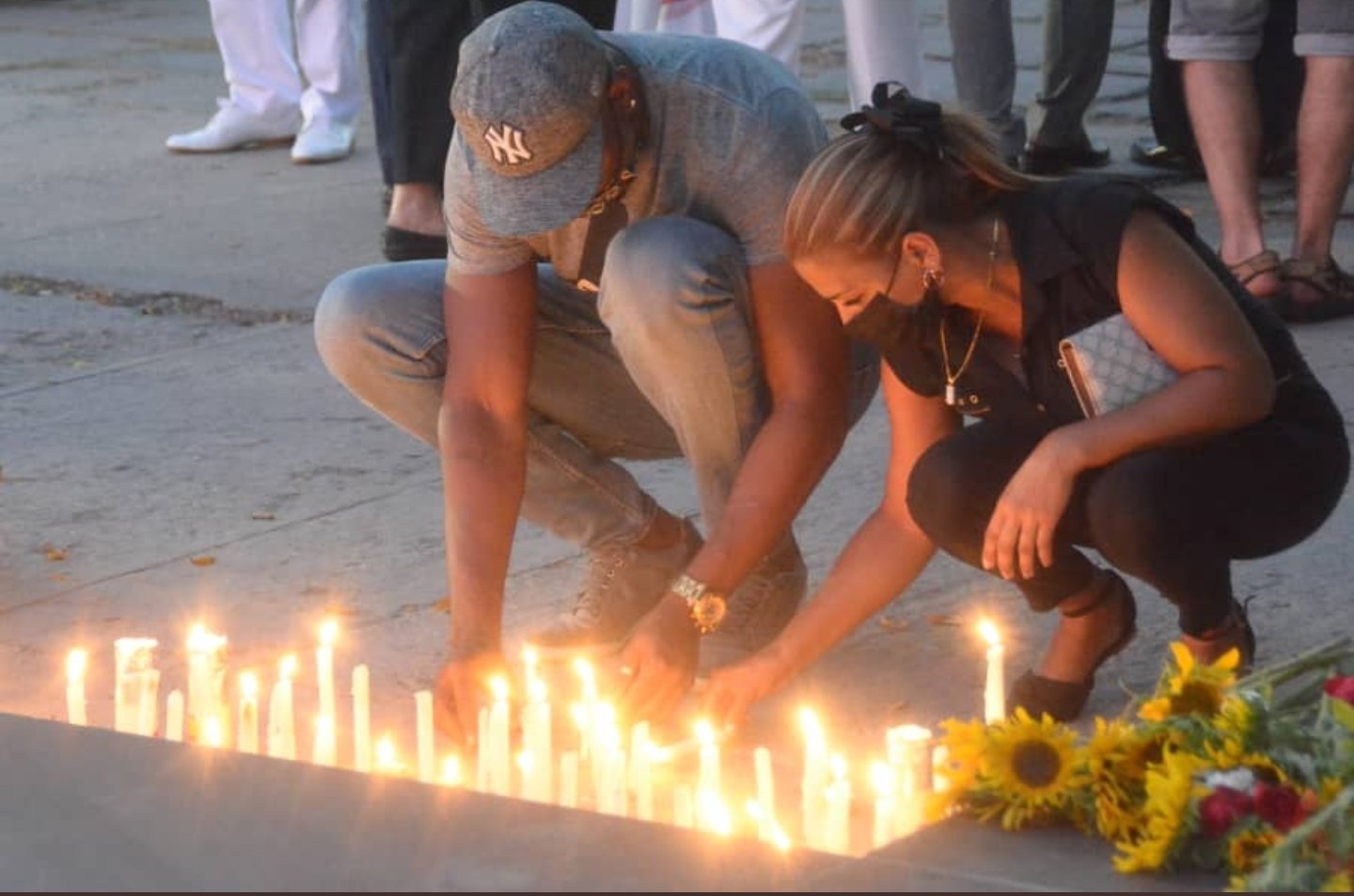 Vestidos de negro, Díaz-Canel y su esposa, Lis Cuesta, depositaron rosas rojas y prendieron velas en memoria de las víctimas de la tragedia, que conmocionó al país, tras guardar un minuto de silencio.