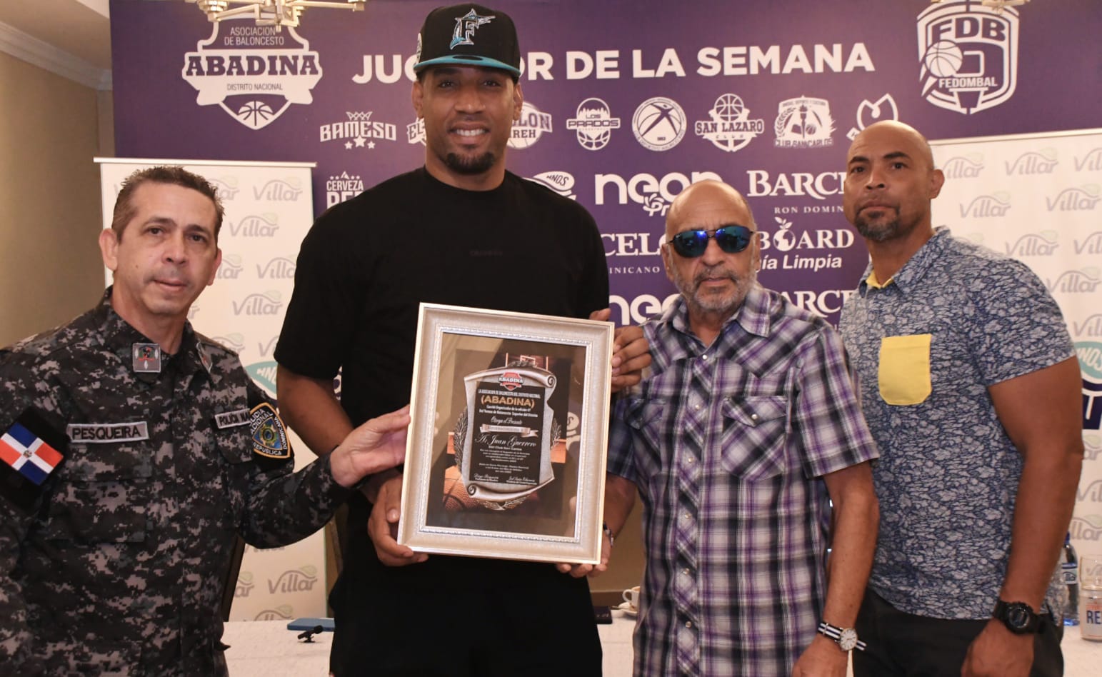 El coronel (PN) Diego Pesqueira, presidente de Abadina, y Fernando Teruel, director general del TBS Distrito 2023 entregaron los premios a Guerrero, quien fue acompañado por el exjugador Jorge Almánzar (La Tata), actual presidente del club San Carlos.