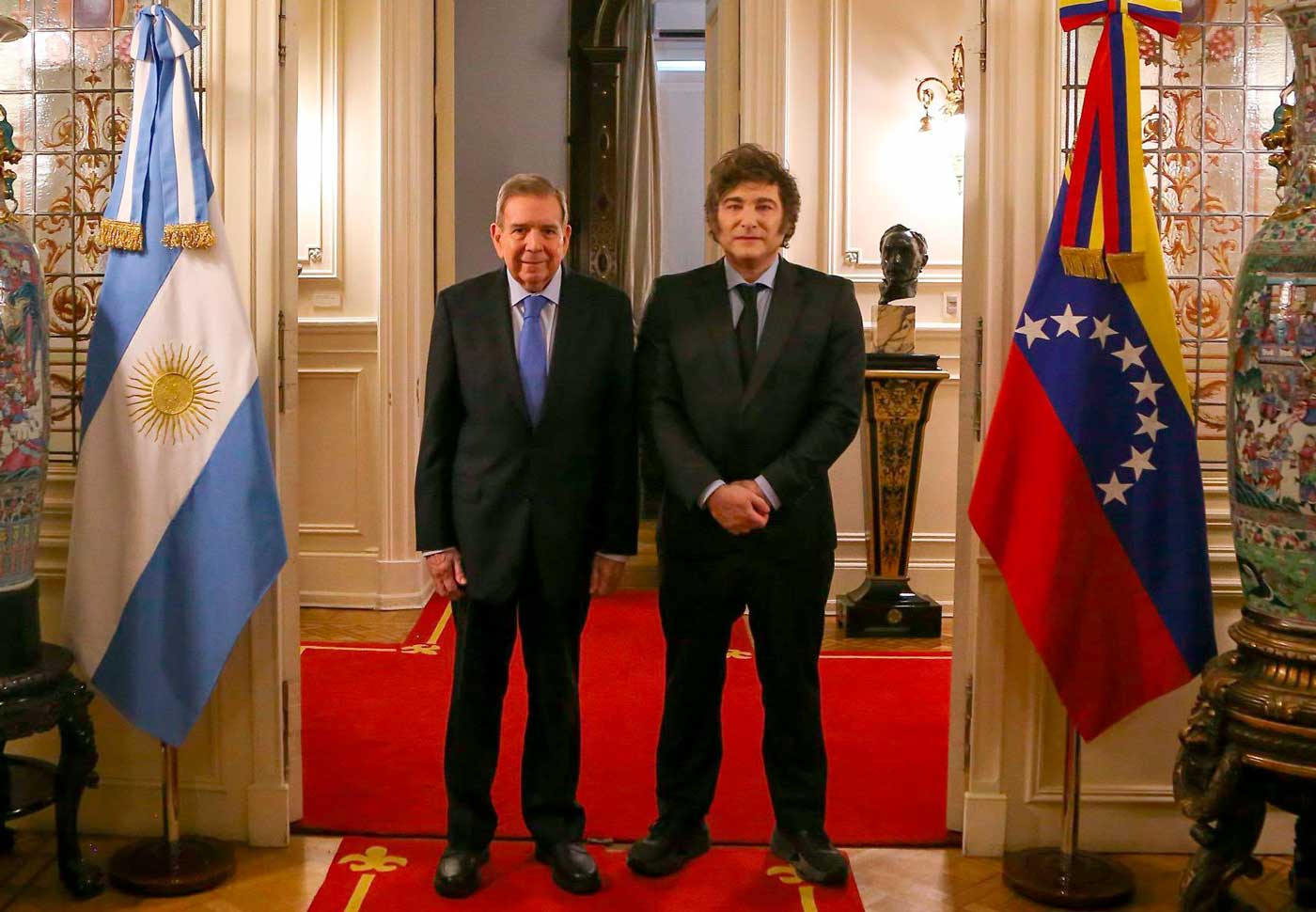 El presidente de Argentina, Javier Milei (i), posa con el líder opositor venezolano Edmundo González Urrutia este sábado, en la Casa Rosada en Buenos Aires.