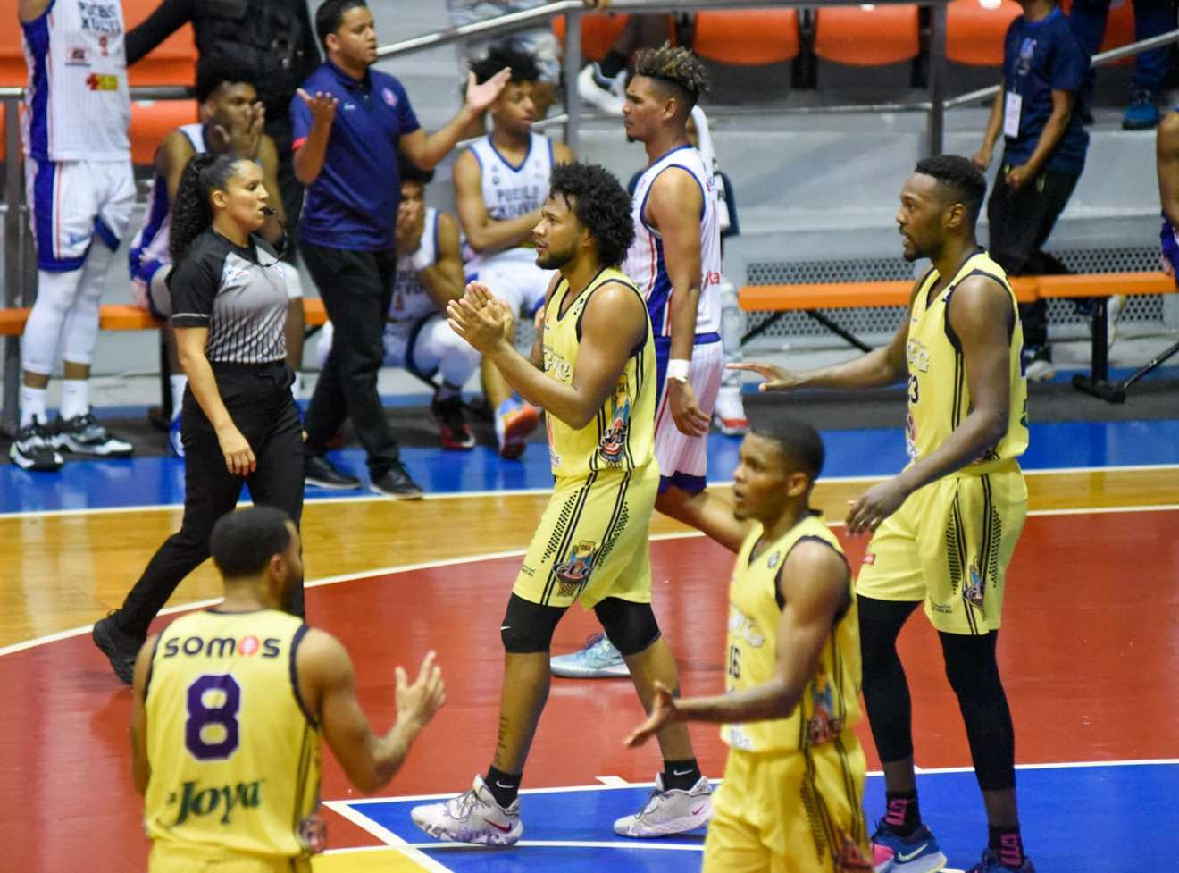 El primer cuarto del juego Pueblo Nuevo domino 27-19, el segundo cuarto lo perdió 22-26 y se fueron al descanso con marcador de 49-45, teniendo como mejor anotador a Nuew Williams con 14 puntos, cinco asistencias y tres rebotes, Bryant Martínez agrego 10 tantos incluyendo dos lances detrás del arco, y cinco rebotes, por GUG Jaelyn J. Coston 10 puntos con cuatro rebotes, Iriel López anoto nueve puntos y Joan Peña ocho puntos cada uno.