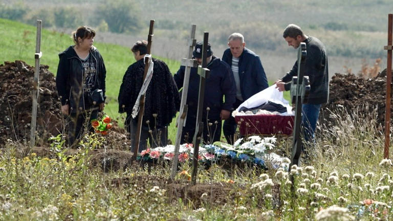 Y mientras bajan el ataúd al suelo, el cual es atentamente observado por algunos dolientes, los bombardeos no paran de romper el silencio.