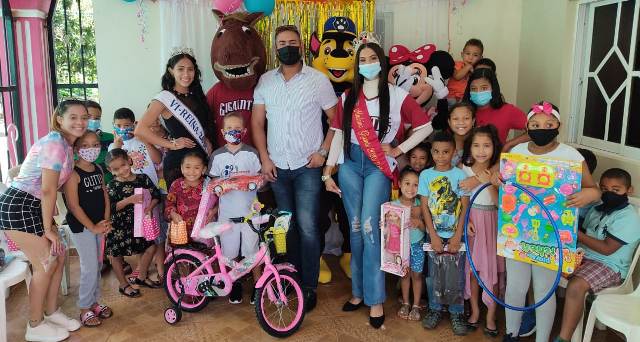La señorita Elizabeth Salazar Ureña acompañada de la virreina Lorenny Gutiérrez y Yeli Santos llevaron la alegría a cientos de niños de diferentes sectores de esta ciudad y comunidades aledañas a este municipio.