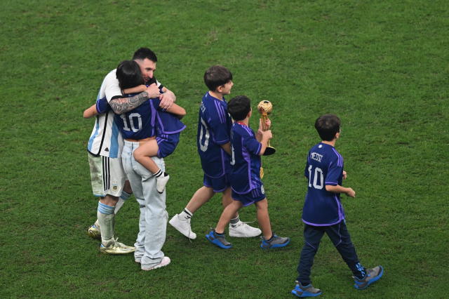 Desde el campo de juego, el rosarino divisó a Antonela Roccuzzo, su pareja, y sus tres hijos, a los que les dedicó un sentido festejo con la frase: “Ya está”. Así, graficó el suplicio que debió atravesar durante años para poder llegar a esta instancia de poder coronarse campeón del mundo con su país.