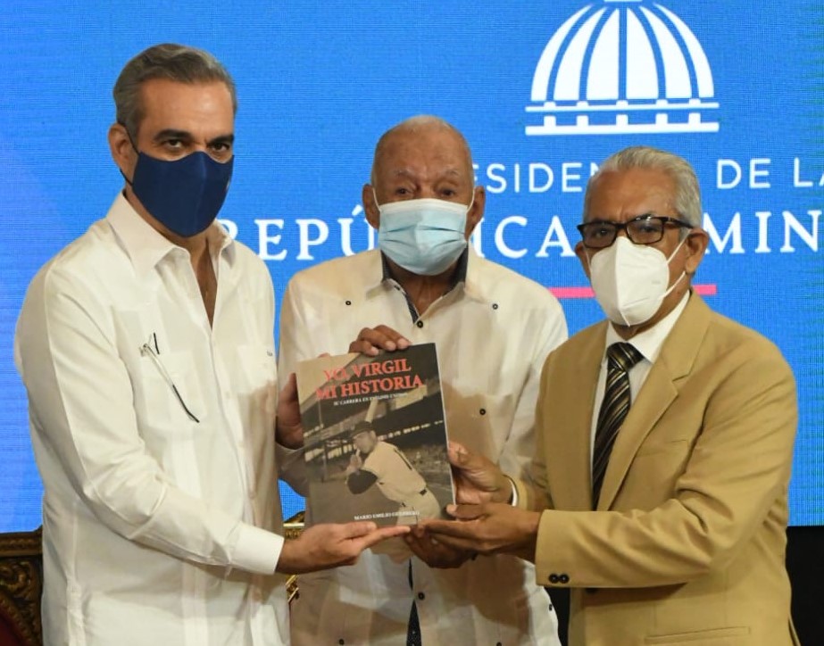 SANTO DOMINGO, RD.- Durante el reconocimiento que el Consejo Nacional de la Persona Envejeciente (CONAPE) realizó a Osvaldo Virgil y que fue encabezado por el presidente de la República, Luis Abinader, en el Palacio Nacional, el periodista Mario Emilio Guerrero presentó su libro, «Yo Virgil, Mi Historia», sobre la carrera del ex pelotero, primer dominicano en jugar en las Grandes Ligas.