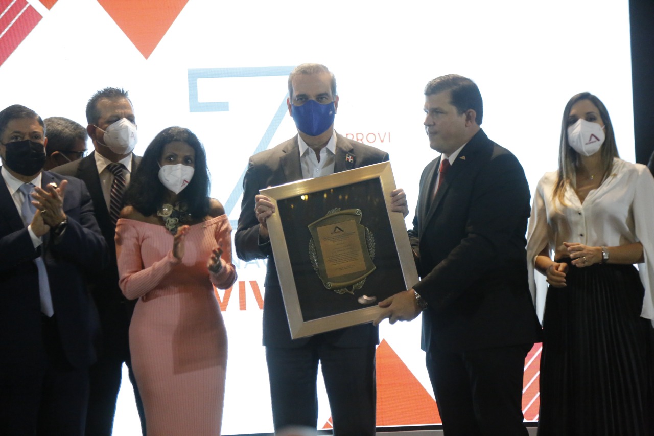 En el acto, la directiva de ACOPROVI entregó una placa de reconocimiento al presidente Abinader por sus aportes al sector vivienda.
