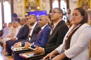 El mandatario junto a la vicepresidenta Raquel Peña; la primera dama Raquel Arbaje y los ministros de Educación, Ángel Hernández y de Educación Superior, Ciencia y Tecnología, Franklin García Fermín, también reconoció a 10 docentes en el ámbito de la Educación Superior, en el Salón Las Cariátides del Palacio Nacional.
