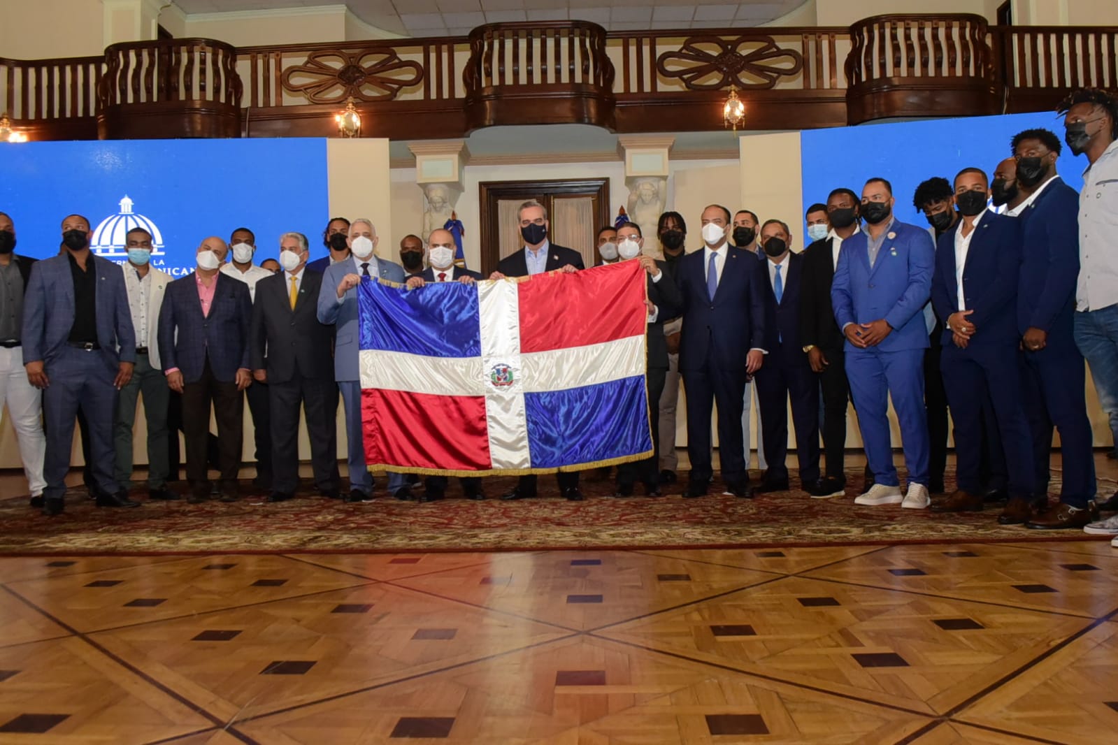 SANTO DOMINGO, RD.- El Presidente de la República, Luis Abinader, recibió y entregó la Bandera Nacional al equipo campeón de la Liga de Béisbol Profesional de República Dominicana (LIDOM), Gigantes del Cibao, en el salón Las Cariátides del Palacio Nacional.