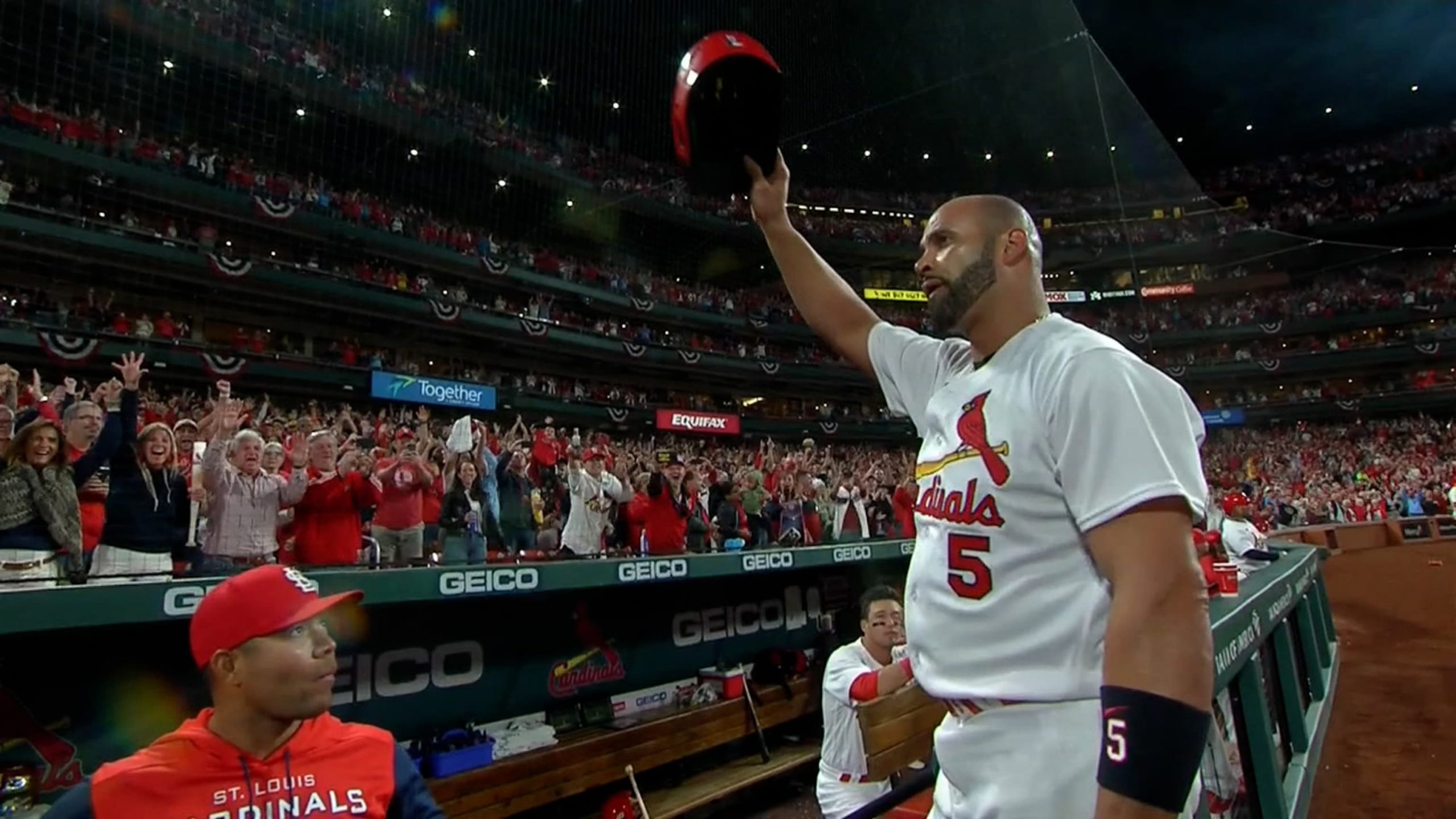 Tras una larga ovación de pie por parte de los aficionados, Pujols salió de la cueva y se quitó su casco para saludar a la multitud, que abarrotó el estadio.