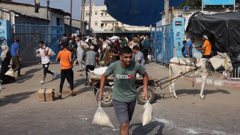 Imágenes de Jan Yunis, en el sur de Gaza, mostraban a hombres sacando frenéticamente cajas y grandes bolsas de un almacén, izándolas sobre sus hombros o cargándolas en sus bicicletas.