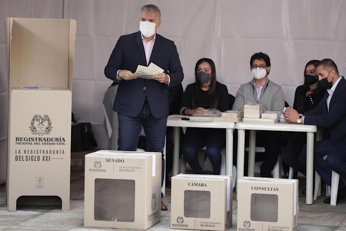 El presidente colombiano, Iván Duque, votó a las ocho en punto de la mañana, cuando se abrieron las mesas, y también madrugaron a votar los precandidatos de las tres coaliciones de centro, izquierda y derecha que hoy escogerán a sus aspirantes presidenciales para los comicios del próximo 29 de mayo.