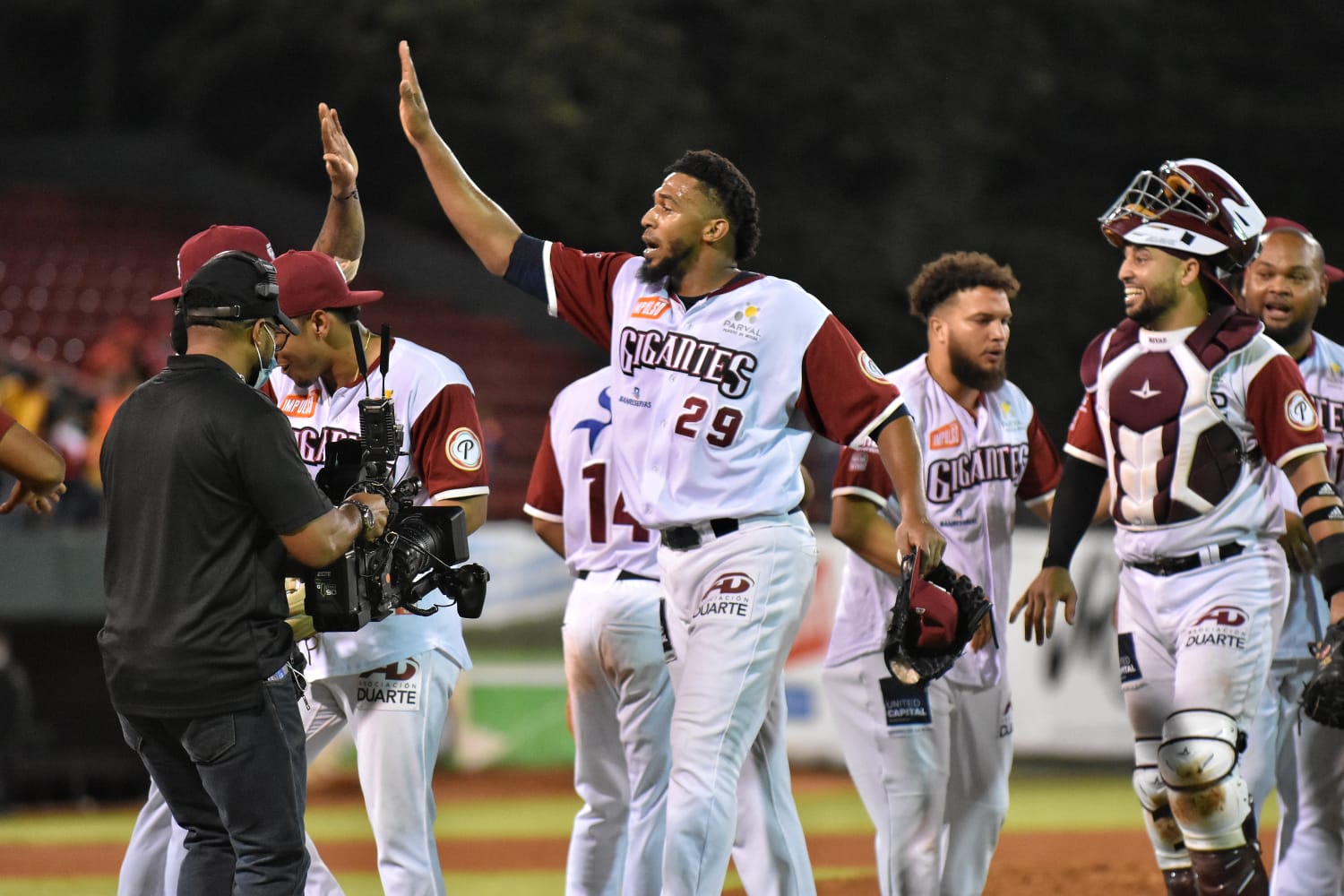 Con las bases llenas los Gigantes, ante lanzamiento descontrolado de Darío Álvarez, Marcell Ozuna anota la cuarta de los francomacorisanos, en la misma entrada Melvin Mercedes negocia un boleto y entra una más para empatar el encuentro 5-5. Hanser Alberto desempata las acciones con batazo empujador de dos vueltas 7-5.