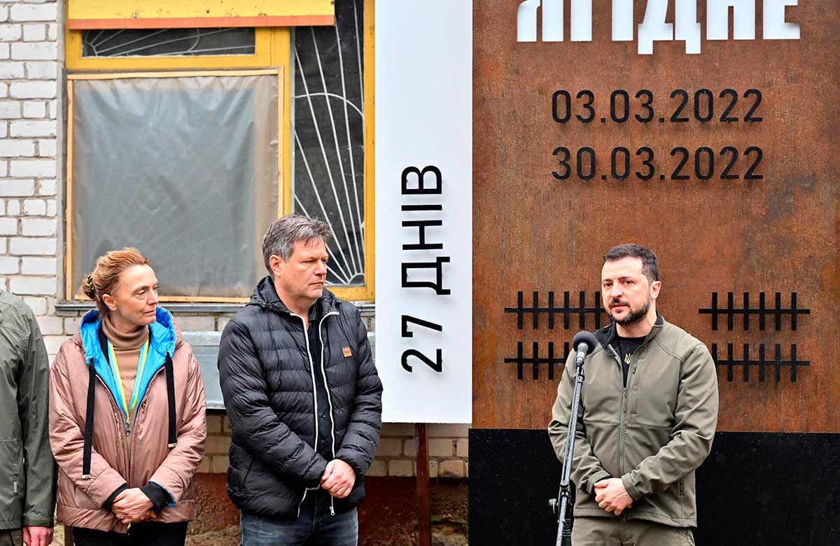 «Todas estas personas vivían en la oscuridad total, esperando el regreso de los ucranianos. Escribieron (en las paredes) los nombres de los que murieron y las fechas, para no olvidar», dijo el mandatario ucraniano en una ceremonia en su homenaje, junto al vicecanciller alemán Robert Habeck.